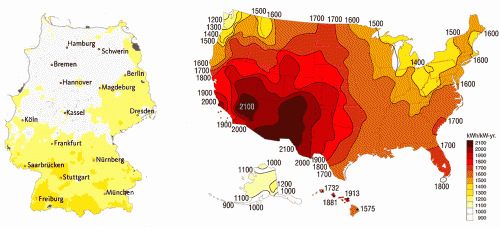 See Germany?  I won't insult your geographic knowledge by pointing at it, but much of Germany is in that yellow-green color which, for solar potential, means (in scientific terms) "it sucks."  Let's zoom in, and compare it to the US to get a feel for it (combined from two charts here)