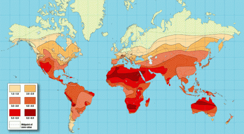 OK, here is the second bit of information.  Here is a world map of solar insolation, which is essentially the total solar energy available to produce power in a location when adjusted for atmosphere, weather, latitude, etc.