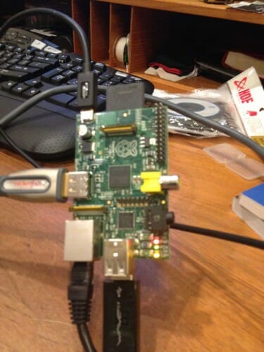 Here is the card. The top wire is a micro-USB 5v power connector. Clockwise from that is a 32GB SD card (for memory), a bunch of empty programmable pins for I/O on the upper right of the board, the composite video connector and audio headphone out, two USB ports with my wireless keyboard connector, the network cable, and on the left the HDMI cable for video out (don't know yet if it has audio out over HDMI). As in the Arduino community, there are already daughter boards for the pin-outs with breadboards, motor controllers, and other gizmos.