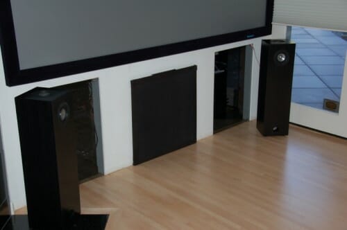The home theater speakers are behind the projection screen (the big gray thing in the picture).  The speakers definitely lose something behind the screen.  Though it is no big deal on movies, for music I wanted speakers outside the screen.  I needed something with high WAF  (a term very common on audio discussion boards, it stands for wife acceptance factor) but that sounded good.  In effect, I needed something relatively small that filled a big room.