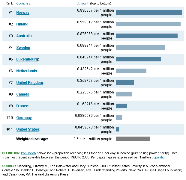 My reaction has always been, so what? Why should I care about how well I am doing vs. the richest folks. Shouldn't I care more how I am doing on an absolute scale? And in fact, on an absolute scale, our poor are doing better than everyone else's poor, and better than many nation's middle classes. I thought this analysis of poverty was interesting: It is the number of people (per million) in a county living on less than $11 per day (lower number and rank is better)