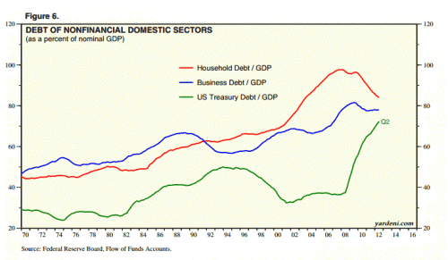 Instead, the CEOs come out and start criticizing the Federal government for stepping in and filling the gap. If it wasn’t for the Federal deficit, the debt-to-GDP chart would be declining even more precipitously, and the economy would be a disaster. Deleveraging is a painful process, and the Federal government is — rightly — easing that pain right now. And this is the gratitude it gets in return!