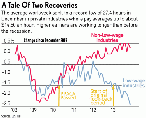 If this chart gets any traction over the next few days, expect to see a lot of ignorance as PPACA defenders claim that the fall in low-wage work hours can't possibly have anything to do with the PPACA because the employer mandate has not even started. Now you know why this argument is wrong. The PPACA, and associated IRS implementation rules, drove companies to convert full-time to part-time jobs as early as 2012.
