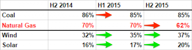 First, there is a problem with this chart in terms of its data selection -- one has to be careful looking at intra-year variations in capacity factor because they vary a lot seasonality, both due to weather and changes in relative fuel prices. Also, one has to be hugely suspicious when someone is claiming a long term trend but only shows 18 months of data. The EIA can provide some of the data for a few years ahead of his table. You can see it is pretty volatile.