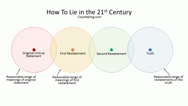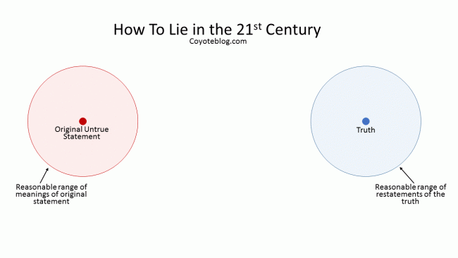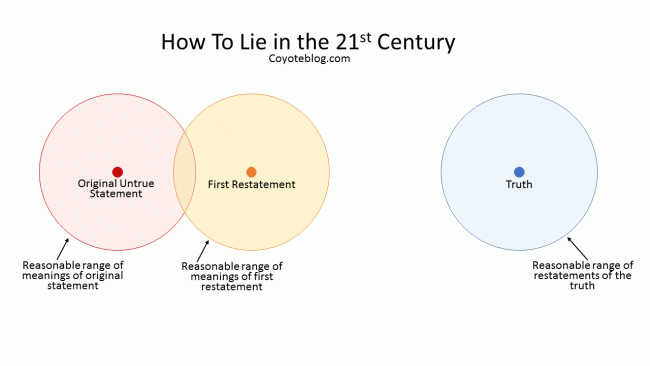 OK, but what happens when that dude in his pajamas does it again, and claims you are still lying with your new restatement. What do you do? Same thing as last time: another restatement. If necessary, you will keep restating until the range of meanings of your restatement overlaps with the truth:
