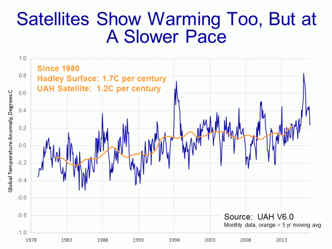 This argument about dueling data sets goes on constantly, and I have not even mentioned the issues of manual adjustments in the surface data set that are nearly the size of the entire global warming signal. But we will leave these all aside with the observation that all data sources show a global warming trend.