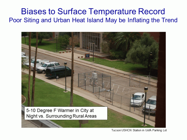 On this scale, the el nino peaks in 1999 and 2017 are quite obvious. Which method, surface or satellites, gets a better result is a matter of debate. Satellites are able to measure a larger area, but are not actually measuring the surface, they are measuring temperatures in the lower tropospehere (the troposphere's depth varies but ranges from the surface to 5-12 miles above the surface). However, since most climate models and the IPCC show man-made warming being greatest in the lower troposphere, it seems a good place to measure. Surface temperature records, on the other hand, are measuring exactly where we live, but can be widely spaced and are subject to a variety of biases, such as the urban heat island effect. The station below in Tucson, located in a parking lot and surrounded by buildings, was an official part of the global warming record until my picture became widely circulated and embarrassed them in to closing it.