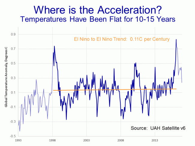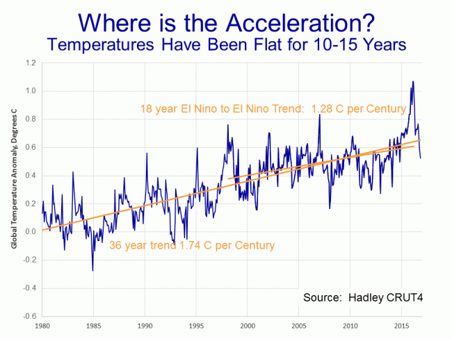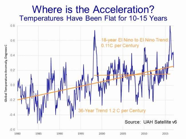 I just updated my climate presentation with data through December of 2016, so given "hottest year evah" claims, I thought I would give a brief update with the data that the media seldom ever provides. This is only a small part of my presentation, which I will reproduce for Youtube soon (though you can see it here at Claremont-McKenna). In this post I will address four questions: