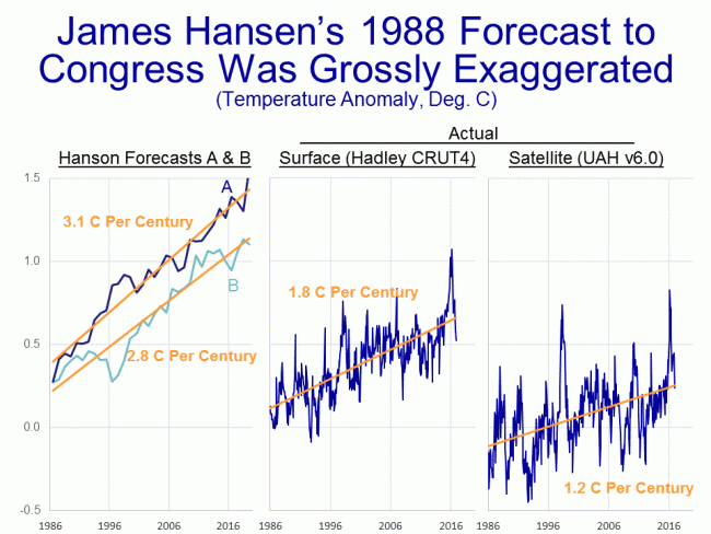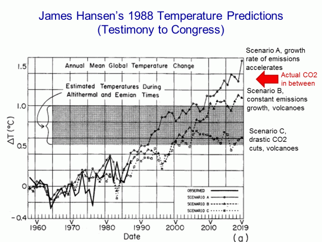 To tackle this one, we have to figure out what was "expected". Al Gore had his crazy forecasts in his movie. One sees all kinds of apocalyptic forecasts in the media. The IPCC has forecasts, but it tends to change them every five years and seldom goes back and revisits them, so those are hard to use. But we have one from James Hansen, often called the father of global warming and Al Gore's mentor, from way back in 1988. His seminal testimony in that year in front of Congress really put man-made global warming on the political map. Here is the forecast he presented: