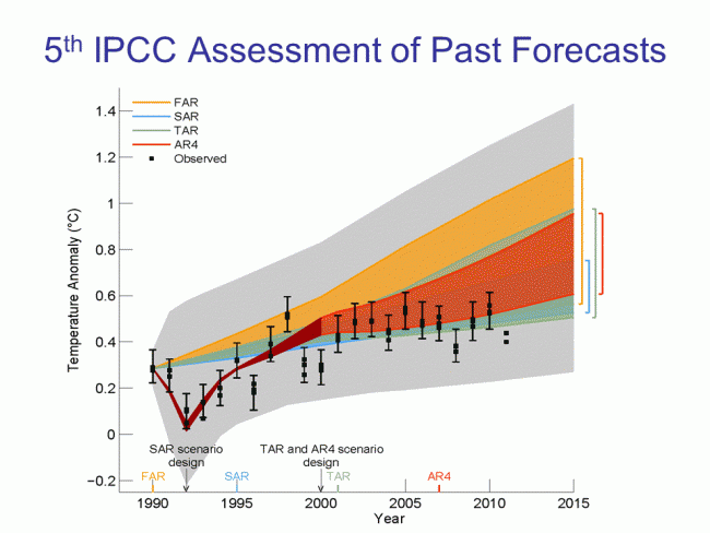 This is a consistent result to what the IPCC found in their last assessment when they evaluated past forecasts. The colored areas are the IPCC forecast ranges from past forecasts, the grey area was the error bar (the IPCC is a bit inconsistent when it shows error bars, including error bands seemingly only when it helps their case). The IPCC came to the same result as I did above: that warming had continued but was well under the pace that was "expected" form past forecasts.