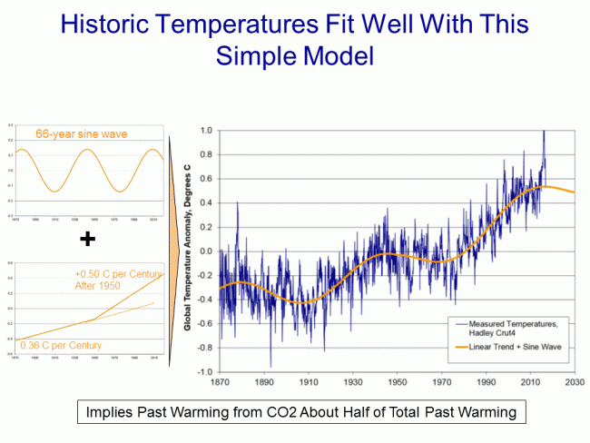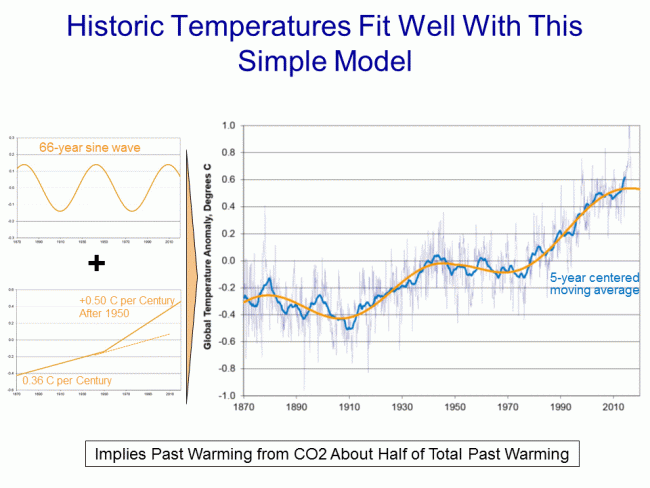 Ten years ago, purely for fun, I attempted to model past temperatures using only three inputs: A decadal cyclical sin wave, a long-term natural warming trend out of the little ice age (of 0.36 C per century), and a man-made warming trend really kicking in around 1950 (of 0.5C per century). I used this regression as an attribution model, to see how much of past warming might be due to man (I concluded about half of 20th century warming may be due to manmade effects). But I keep running it to test its accuracy, again just for fun, as a predictive tool. Here is where we are as of December of 2016 (in this case the orange line is my forecast line):