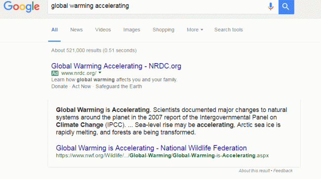 Go into google and search "global warming accelerating". Or just click that link. There are a half-million results about global warming accelerating. Heck, Google even has one of those "fact" boxes at the top that say it is: