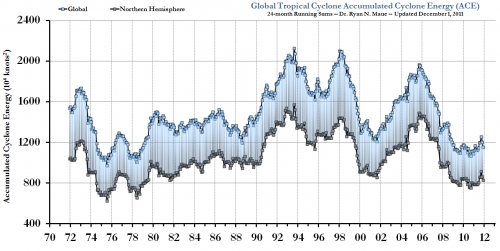 Making this a chart of hurricane landfalls deals with the public perception issue, as landfalls tend to be the only ones we really remember.  But this is actually a terrible metric (even though it makes my point about Irma and Harvey not representing any sort of upward trend) because landfalls are random and may not really represent actual hurricane activity.  A better metric is accumulated cyclonic energy of tropical storms, which looks at a sort of integral of storm strength over time.  This does not show a trend either, but since I cannot find a chart of ACE updated with recent activity I am not going to put it up here.   Here it was as of June of this year, and this chart only goes back to 1970 -- if we had good data early in the 20th century it would have been much higher.