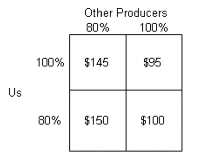 This is a classic prisoner's dilemma game. Let's consider for a moment that we are a large producer with some ability to move prices with our actions but still a minority of the market. Consider a game with two players, us and everyone else. Each player can produce 80% of their capacity or 100%. A grid showing reasonable oil price outcomes from these strategies is shown below: