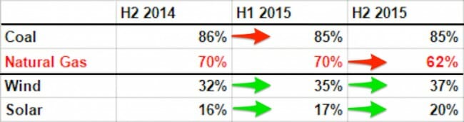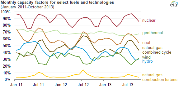 First, there is a problem with this chart in terms of its data selection -- one has to be careful looking at intra-year variations in capacity factor because they vary a lot seasonality, both due to weather and changes in relative fuel prices. Also, one has to be hugely suspicious when someone is claiming a long term trend but only shows 18 months of data. The EIA can provide some of the data for a few years ahead of his table. You can see it is pretty volatile.