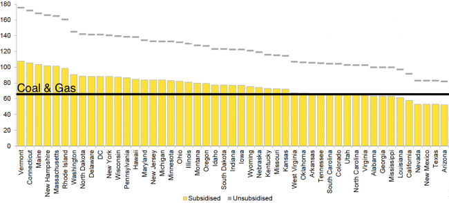 I hate to break it to the author, but a Ferrari would be cheaper than a Ford Taurus if the government subsidized it enough -- that means nothing economically other than the fact that the government is authoritarian enough to make it happen. All his chart shows is that solar is more expensive than coal and gas in every state.