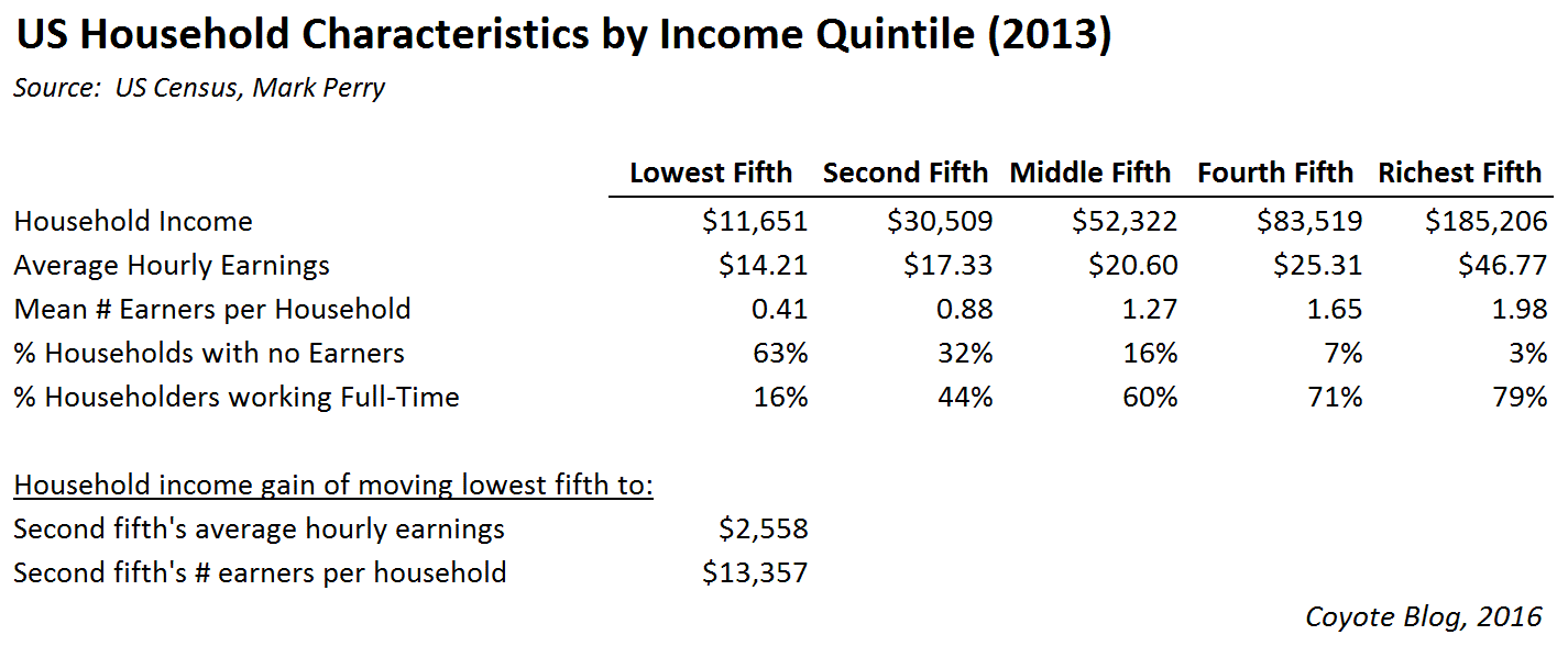 Note the calculations in the last two lines, which look at two approaches to fighting poverty. If we took the poorest 20% and kept their current number of hours worked the same, but magically raised their hourly earnings to that of the second quintile (ie from $14.21 to $17.33), it would increase their annual household income by $2,558, a 22% increase (I say magically because clearly if wages are raised via a minimum wage mandate, employment in this groups would drop even further, likely offsetting most of the gains). However, if instead we did nothing to their wages but encouraged more employment such that their number of workers rose to that of the second quintile, this would increase household income by a whopping $13,357, a 115% percent increase.