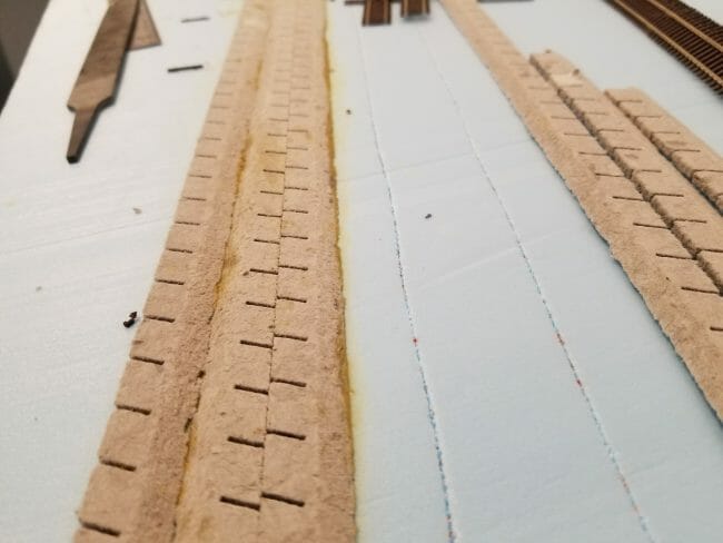 So as we were saying last time, I printed the track plan full size, and then traced the lines onto the foam below using a pounce wheel, a sewing tool that looks like a spur. You can see below that the traced lines were a bit wavy so I thin used an 8 foot long straight edge and a sharpie to draw the final centerlines for the track. Then, I started putting down the sub roadbed, which are pre-milled pieces of homosote.