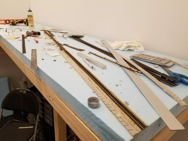 Below, more progress. You can also see wires poking through as I start the tedious process of wiring power to all the track. Also in the foreground you can see a code 40 turnout I built. I am using it to figure out how to do the transitions from code 55 to code 40 track.