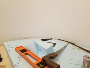 Why not just paint the walls, you might ask? Well the styrene sheet is a lot smoother even than drywall, but the payoff is really in the corner. Here is the corner with and without the sheet. Sky does not have corners.