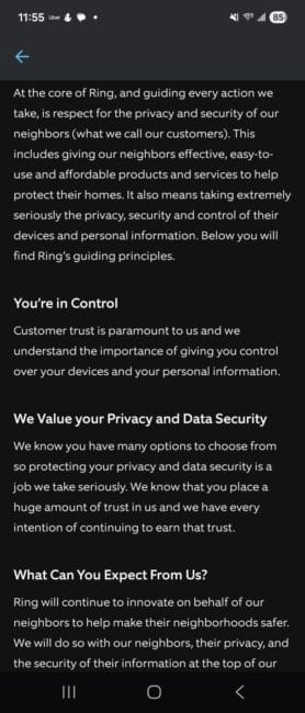 In the same control center there is a privacy tab.  I clicked on that, but there are no settings.  Only a promise to be really really nice  and make our privacy their highest priority but no specific commitments on data privacy.  Also note the use of "neighbors" over and over.  It is as if they are trying to establish some right to collective privacy (whatever the f*ck that is) instead of individual privacy.