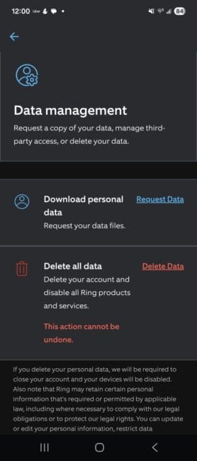 This is the whole screen. Notice anything?  As promised, you can download your personal data, I guess just to see what the CIA is looking at.  You can delete your data, at the cost of bricking your products.  But there is no actual option to manage 3rd party data access.  It is promised in the privacy statement, it is promised in the menu header, but it does not exist.  After an hour on their site and in the app, I still don't know who has access to my doorbell camera image.