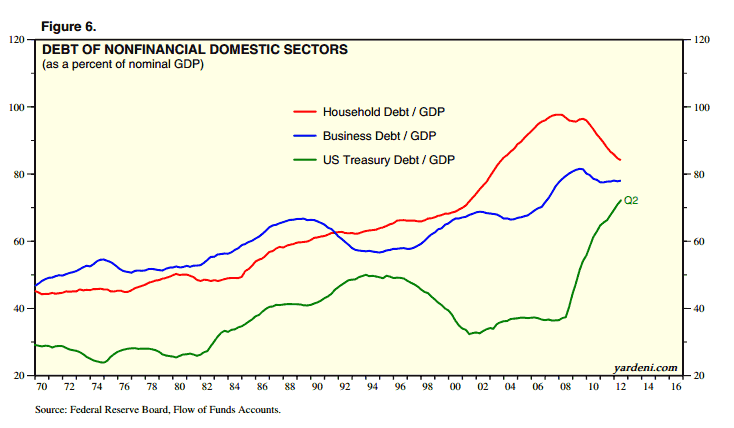 Government debt is basically offsetting the consumer deleveraging. Since consumers have to eventually pay this government debt off, as they are taxpayers too, then the government is basically flipping consumers the bird, forcing them to take on debt they are trying to get rid of. Hard working consumers think they are making progress paying off debt, but the joke is on them - the feds have taken the debt on for them, and the bill will be coming in future taxes for them and their kids.