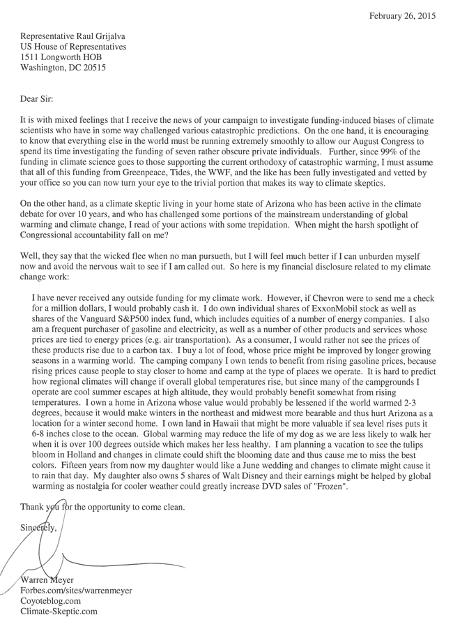 Unfortunately, nowadays people like the New York Times and our own Arizona Representative Raul Grijalva seem to feel like the job is done after the first sentence. They have decided that the best way to refute recent scientific work by a number of climate scientists is to try to show that some of their funding comes from fossil fuel companies.