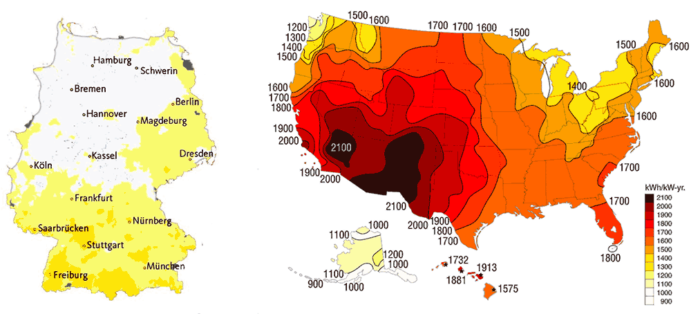 See Germany? I won't insult your geographic knowledge by pointing at it, but much of Germany is in that yellow-green color which, for solar potential, means (in scientific terms) "it sucks." Let's zoom in, and compare it to the US to get a feel for it (combined from two charts here)