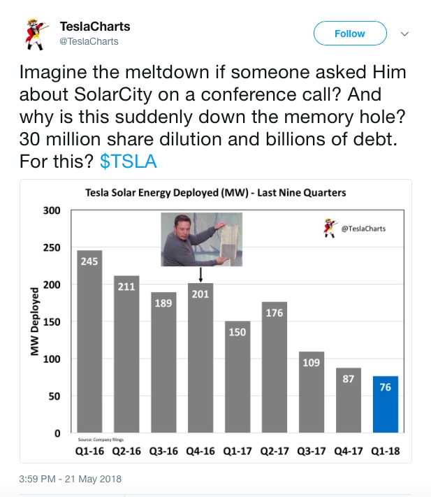 In the past I have limited myself to two issues. The first is the outright fraud of the Tesla acquisition of SolarCity, another Musk company that was going down the drain until Tesla bailed it out. The transaction appeared (even at the time) so transparently self-serving to Musk and his family that it just screamed fraud, and time has only made this clearer. Musk sold the synergy-less acquisition to Tesla shareholders based on a solar shingle technology he portrayed as ready to go, but that still has not seen the light of day 2 years later. In retrospect, it is crystal clear the solar shingle was a sham that was fraudulently hyped to make the deal go through. This fire and forget approach to new product announcements has become very familiar at Tesla -- Musk scored extra subsidies from California with a battery swap technology he demonstrated one time and then has never been seen again, and Musk announced a new Semi truck and harvested a number of deposits for the vehicle and then has not even mentioned the product for months. Since the acquisition, SolarCity new installations have fallen precipitously every quarter, demonstrating that Tesla had no real commitment to the enterprise, and this is only going to get worse as Musk announced that its last remaining sales channel is going to be closed.